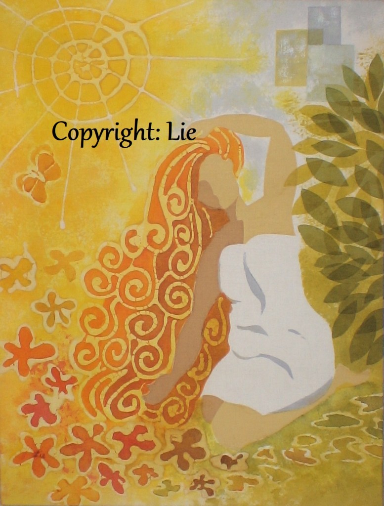 I bildgalleriet såg jag att den är väldigt lik ett textiltryck som jag har gjort, som heter Uppvaknande. Gult som Solarplexus och kraften i att våga vara sig själv. ”Vi är mer än vad andra tror om oss… eller vad vi tror om oss själva”.