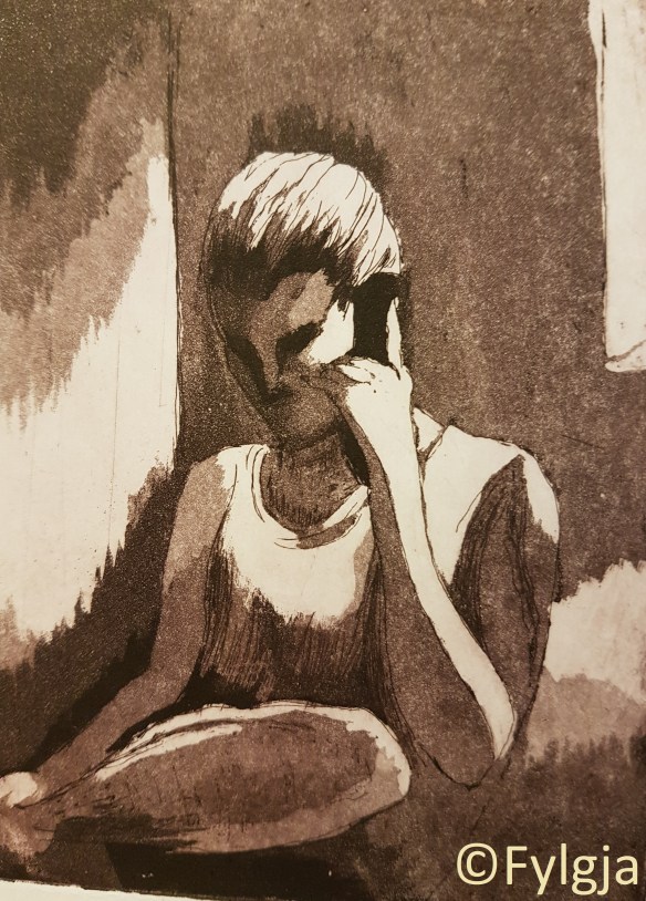 I bilden SAMTAL lyser månljuset in genom fönstret. Det är en bild som jag gjort i en grafisk teknik som heter akvatintetsning där man jobbar i kopparplåt med olika etsningsmetoder och sedan trycker en serie grafiska blad. CC BY-NC-ND, http://creativecommons.org/licenses/by-nc-nd/2.5/se/