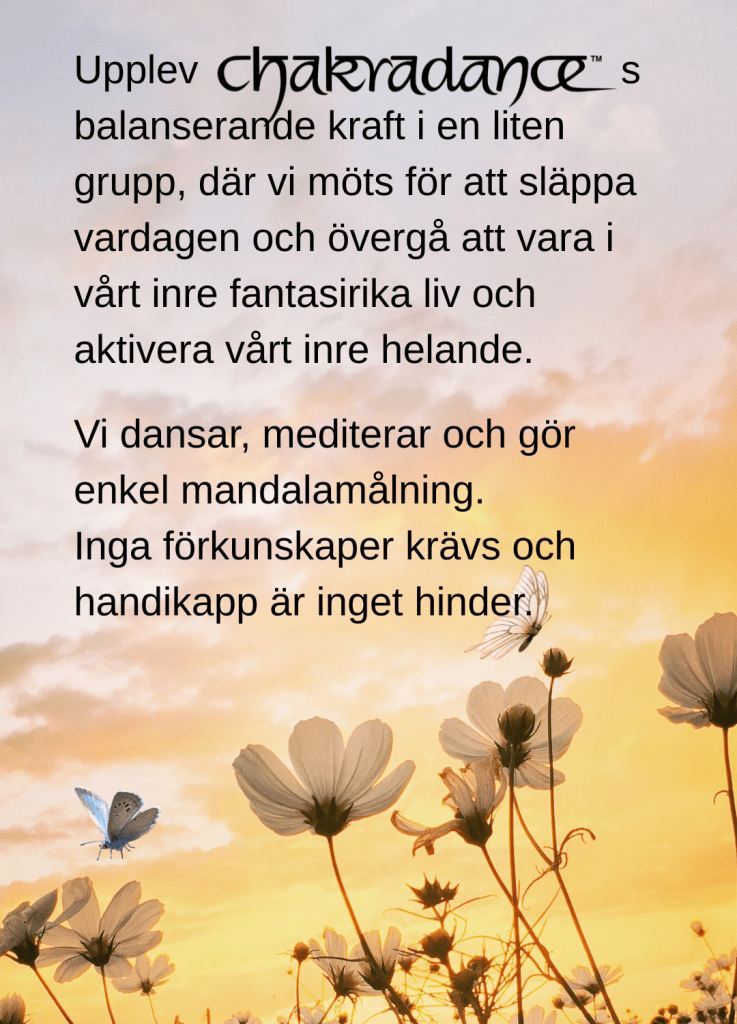 Min förhoppning är att väcka intresse för den välgörande meditation i rörelse som Chakradance™ är. Om du läser det här och tänker att det skulle passa en vän som bor på orter i närheten av de städer jag räknade upp, får du mer än gärna vidareförmedla informationen. 🙏